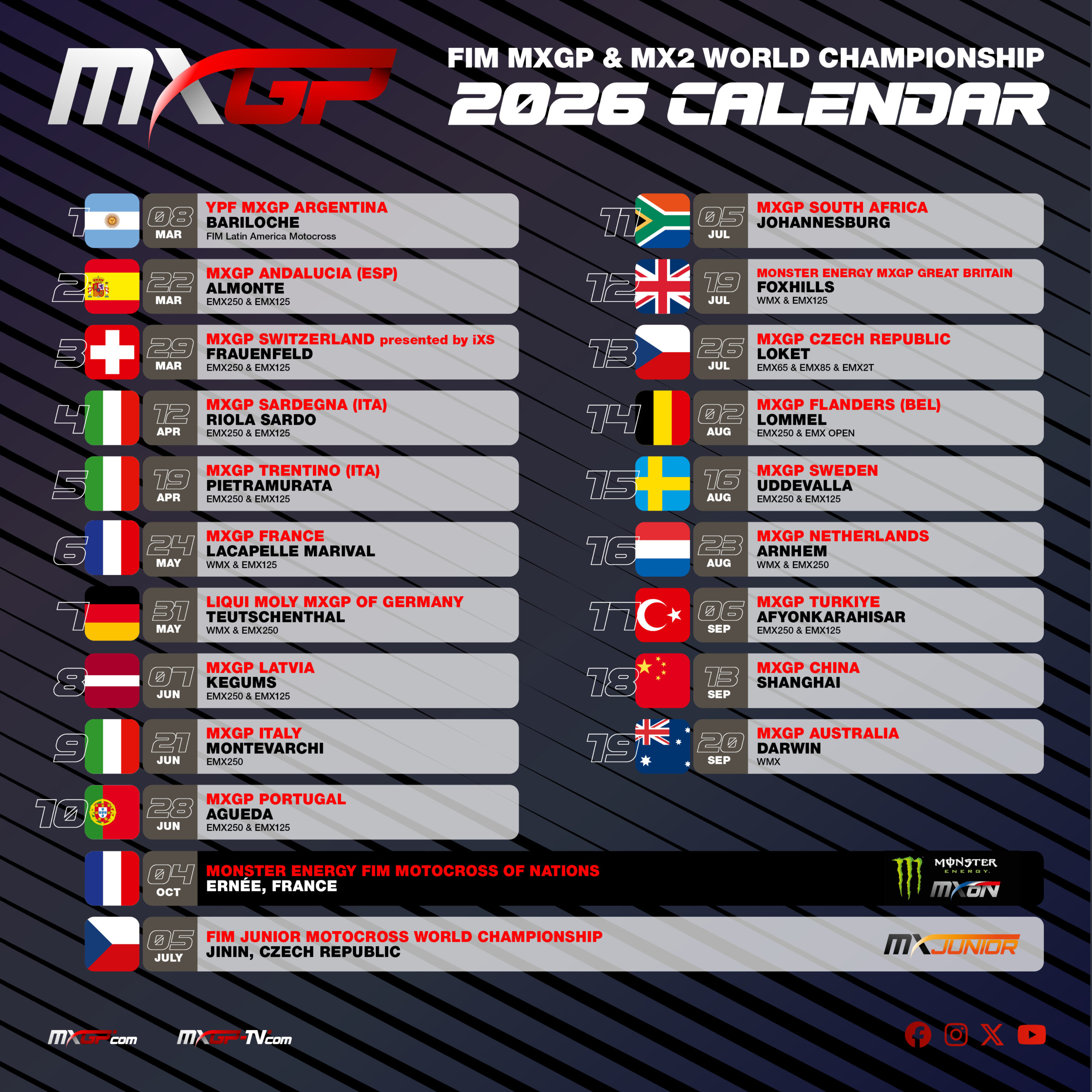 Sporting Documents MXGP Argentina documents: 2026 Provisional Calendar FIM Motocross World Championship Last update February 18 , 2026 Supplementary Regulations 2026 FIM Motocross World Championships – Bariloche, Río Negro (ARG)
