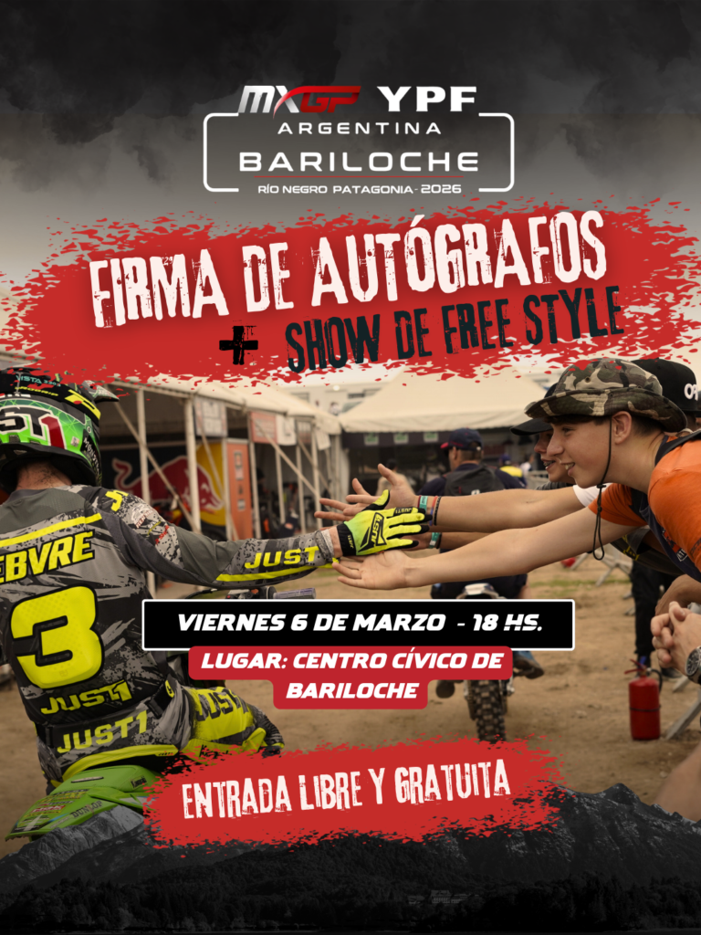 San Carlos de Bariloche vivirá una jornada especial en la antesala del evento deportivo internacional más importante del motocross. Este viernes 6 de marzo, a las 18:00 horas, el emblemático Centro Cívico será escenario de la firma oficial de autógrafos del MXGP Argentina YPF, donde los pilotos del Campeonato Mundial de Motocross compartirán un momento único con el público.